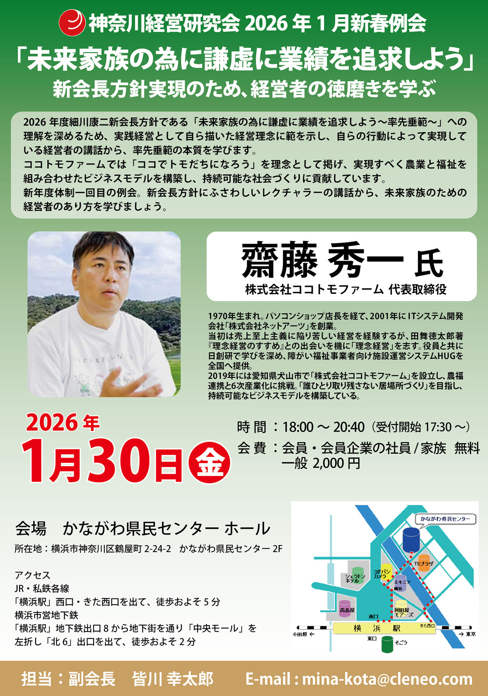 直近開催予定の例会2026年1月9日2026年1月9日 ~2026年1月新春例会~ 日時 2026年1月30日(金) 18:00〜20:40(受付開始17:30〜) 「未来家族の為に謙虚に業績を追求しよう」 新会長方針実現のため、経営者の徳磨きを学ぶ 場所 かながわ県民センター2Fホール