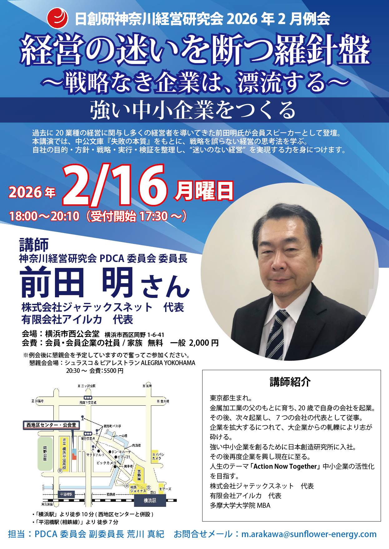 直近開催予定の例会2026年2月10日2026年2月10日 ~2026年2月例会~ 日時 2026年2月16日(月) 18:00〜20:10(受付開始17:30〜) 「経営の迷いを断つ羅針盤」 ~戦略なき企業は、漂流する~ 強い中小企業をつくる 場所 横浜市西公会堂